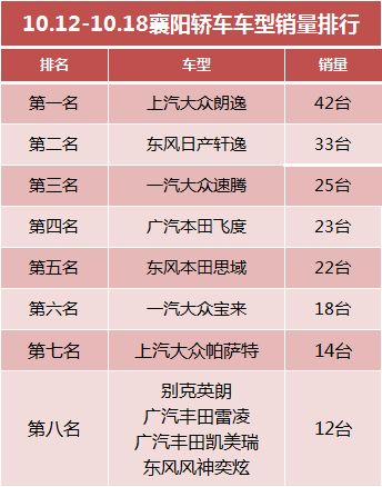 销量数据丨襄阳一周汽车销量前十排行榜